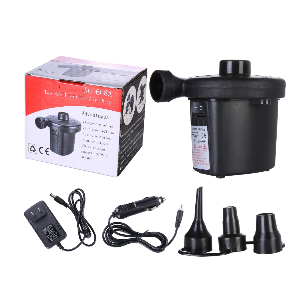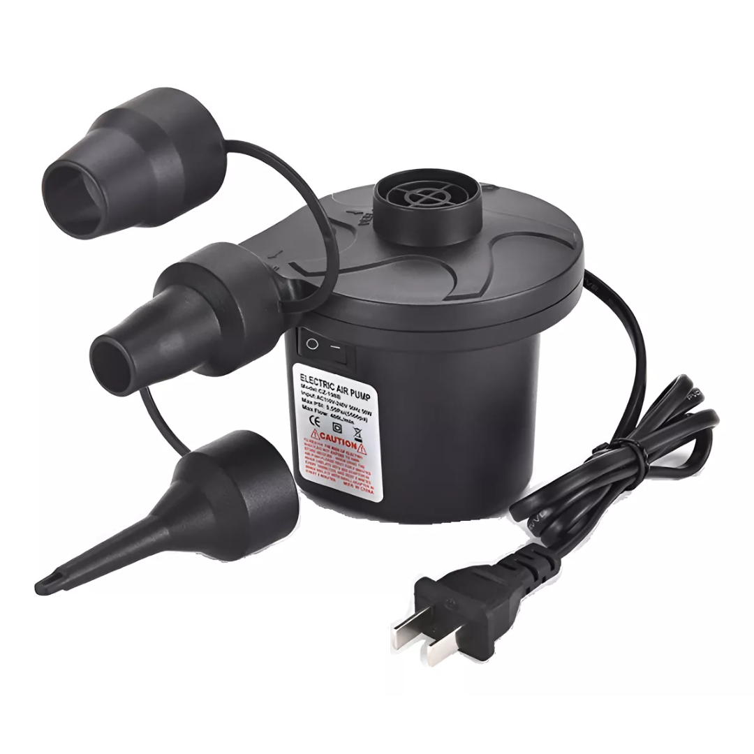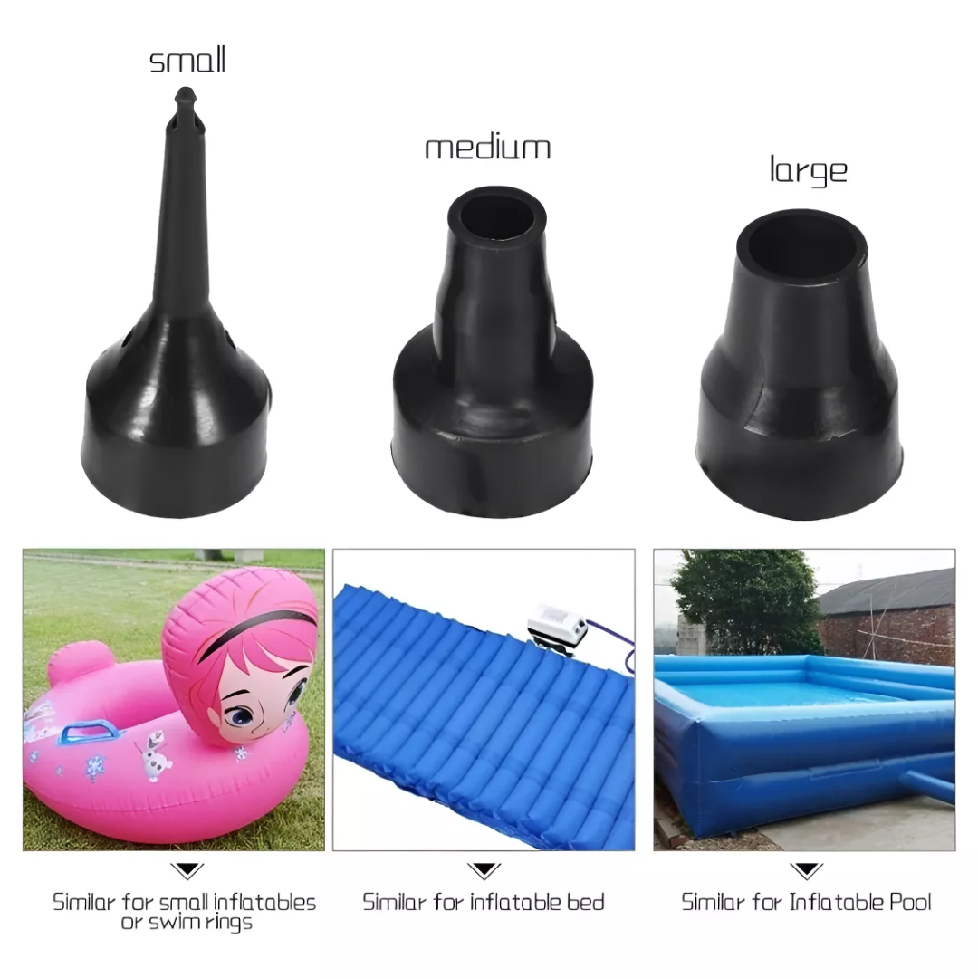 - 3 boquillas adaptables: Incluye tres tamaños de boquillas para adaptarse a una gran variedad de válvulas y productos inflables.